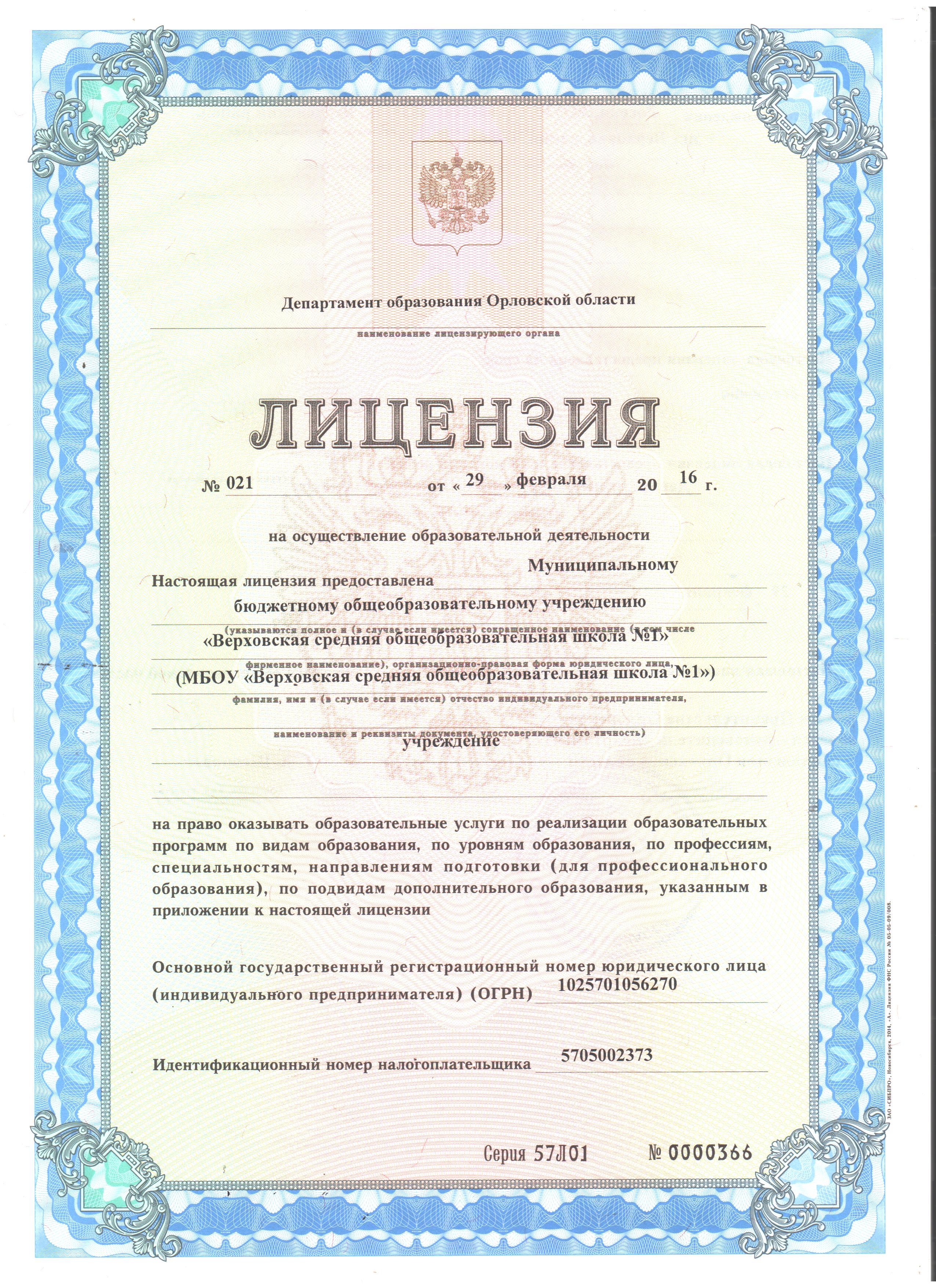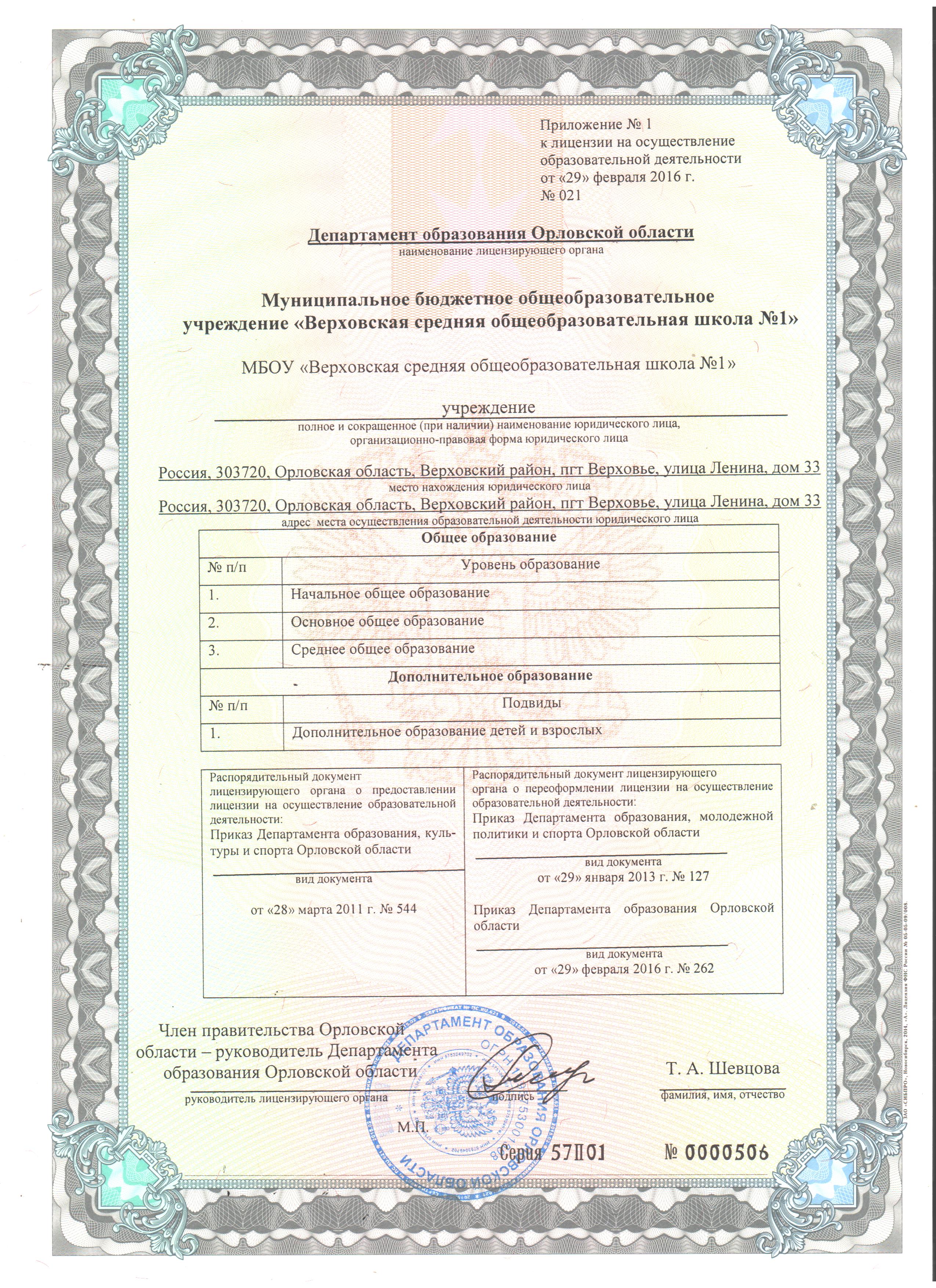 Полное наименование образовательного учреждения: Муниципальное бюджетное общеобразовательное учреждение "Верховская средняя общеобразовательная школа № 1"